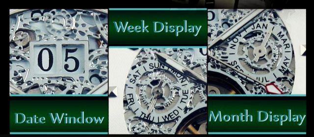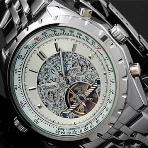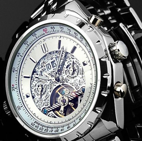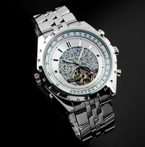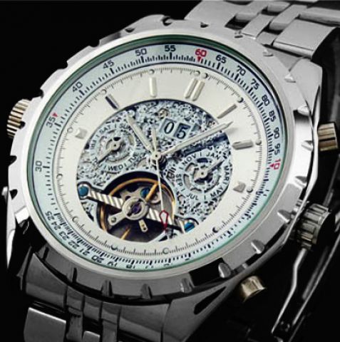 Krásne a vysoko luxusné hodinky s Tourbillon, čo je male pohybujúce sa koliesko. Tourbillon sú opatrené hodinky luxusných značiek, ako Breitling, Omega a pod a ich cena je zhruba stonásobne vyššia, než u týchto hodiniek. Hodinky obsahujú: ukazovateľ času, dňa, týždňa a mesiaca. Jedná sa o skvelý darček a o lacné hodinky s Tourbillon.